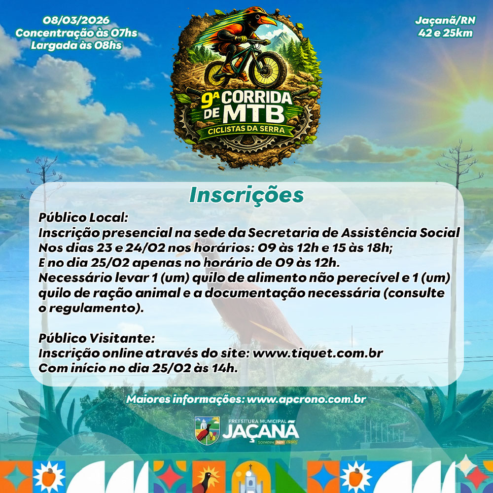 Para o Público Local a inscrição será presencial na sede da Secretaria de Assistência Social nos dias 23 e 24/02 nos horários: 09 às 12h e 15 às 18h; E no dia 25/02 apenas no horário de 09 às 12h. É necessário levar 01 (um) quilo de alimento não perecível e 01 (um) quilo de ração animal e a documentação necessária (consulte o regulamento).